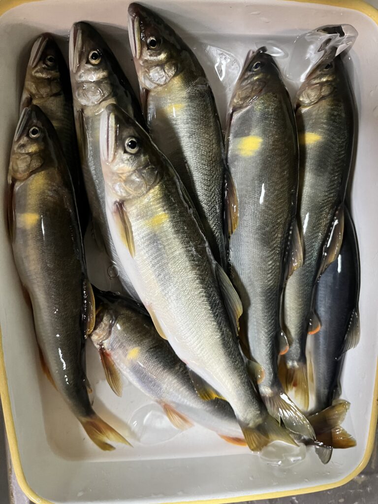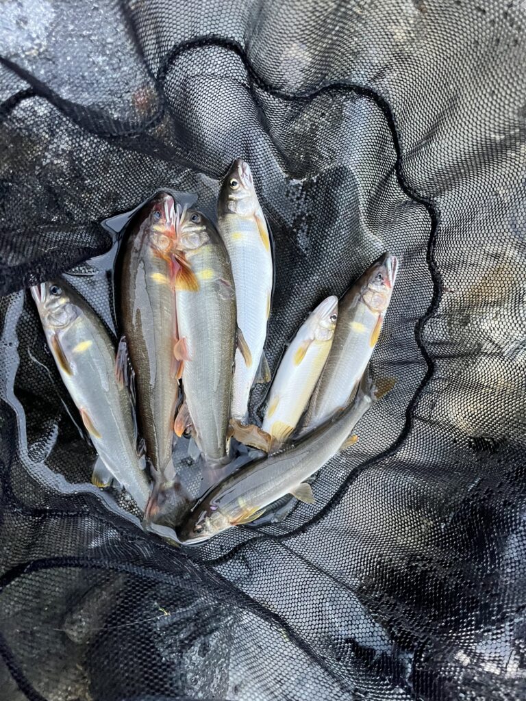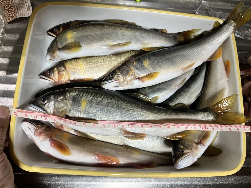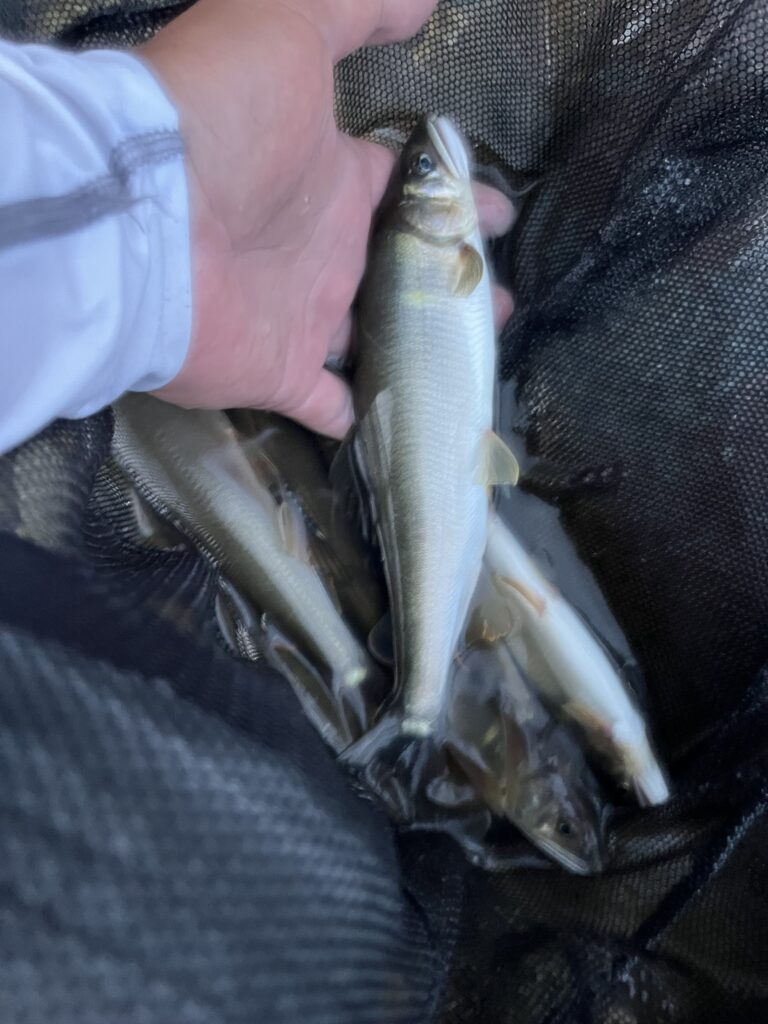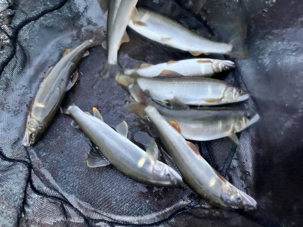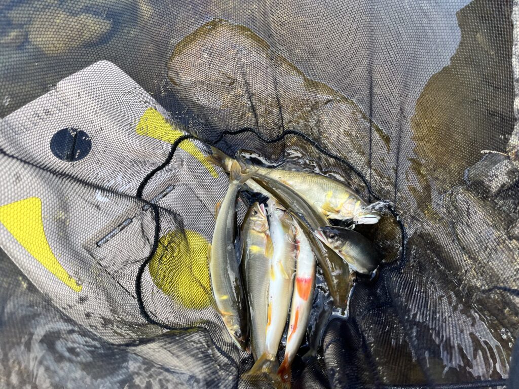 段々瀬なので、鮎が下流に走ったときの引き抜きで4本ほど身切れさせてしまった。途中から溜めつつ自分が下って距離を詰めていくように丁寧に対応することでバラしを回避するようにした。結果的に納得行く釣りができた。